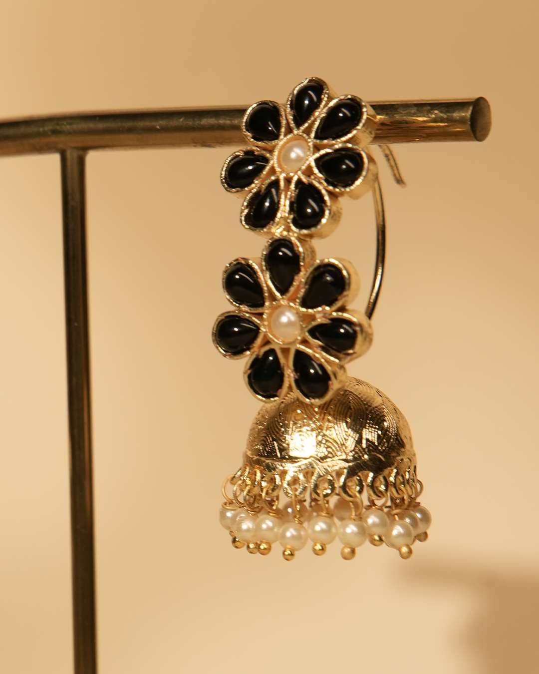The Chandni earrings are circular hoops adorned with beads and pearls, create a contemporary unique piece