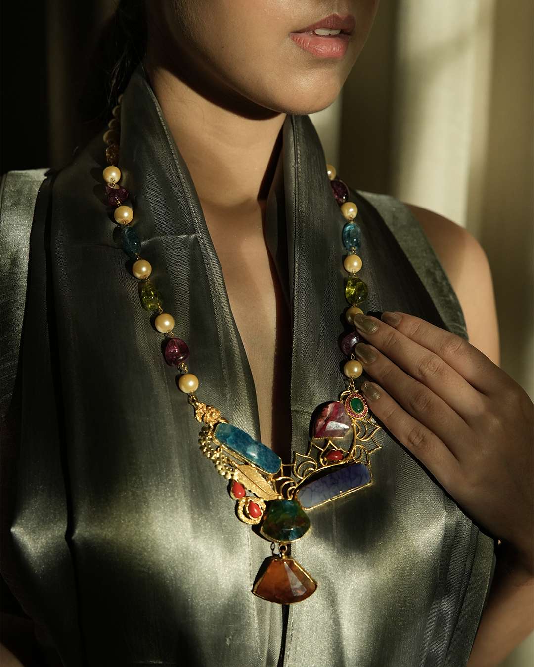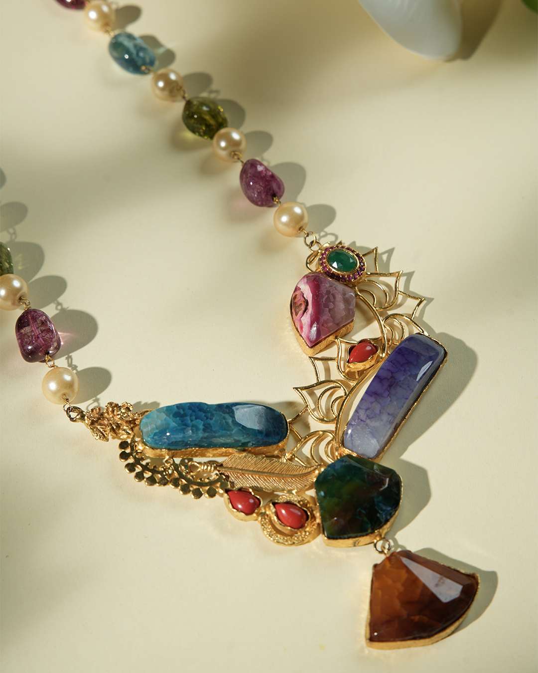The Mystic Mirage Necklace brings the enchanting beauty of multi-colored agate stones to life in a western inspired design. This Indo-western necklace adds a touch of sophistication to your special occasion or your everyday attire.